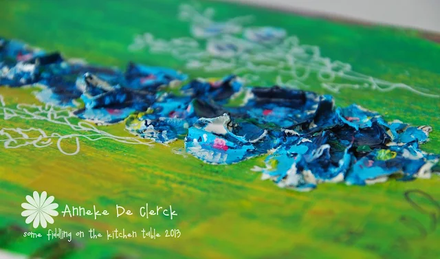 Eerst verschillende laagjes aangebracht: servetten met tekst, gesso, Golden acrylverf...