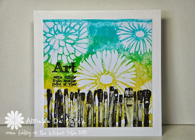 Bij kaartje één eerst de verfborstels gestempeld. Vooraleer de achtergrond te kleuren de witte delen bewerkt met Teykol.