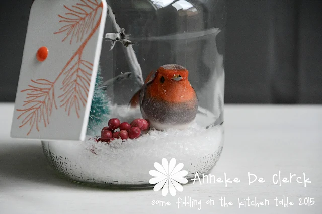 Met een lijmpistool een kerstboompje (Action) en een vogel (Artemio) op de bodem gekleefd. De vogel lijmde ik eerst op een klein houtblokje.