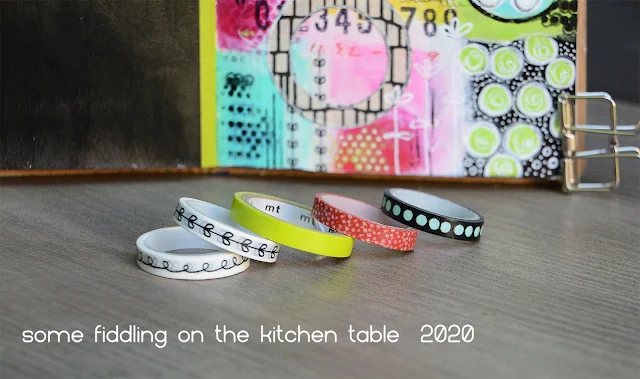 I started by painting the background with lime, turquoise, yellow, white, black and pink paint. I added various dots using stencils, lids from spray bottles and my fingers.