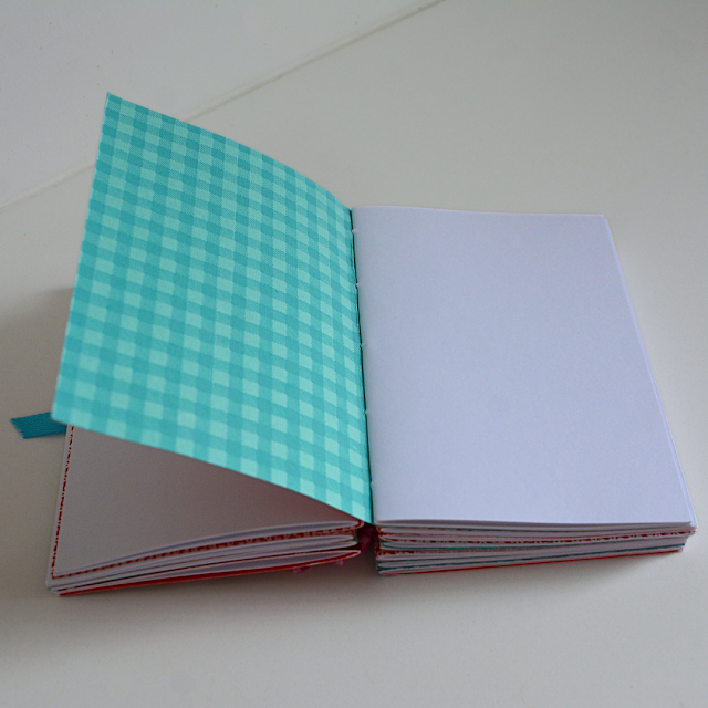 Voor het papier van de omslagen rond de katernen koos ik kleuren die matchen met de kleuren van de kaften.