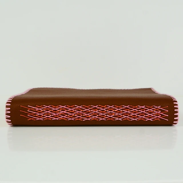For the binding I used a double herringbone stitch and pink and orange waxed thread.